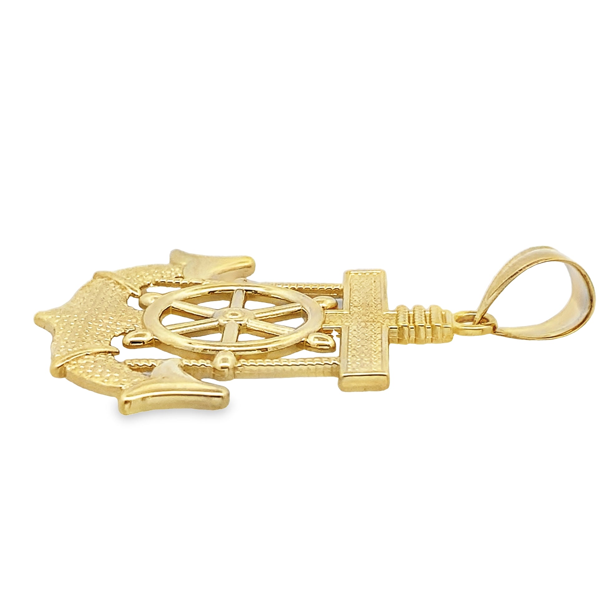 10K Yellow Gold Anchor & Ship Wheel Pendant 3.8Dwt This exquisite pendant showcases a timeless nautical motif, crafted in luxurious 10K yellow gold and weighing a substantial 3.8 dwt. Adorn yourself with this stylish and elegant piece, fit for those with a taste for the finer things in life.