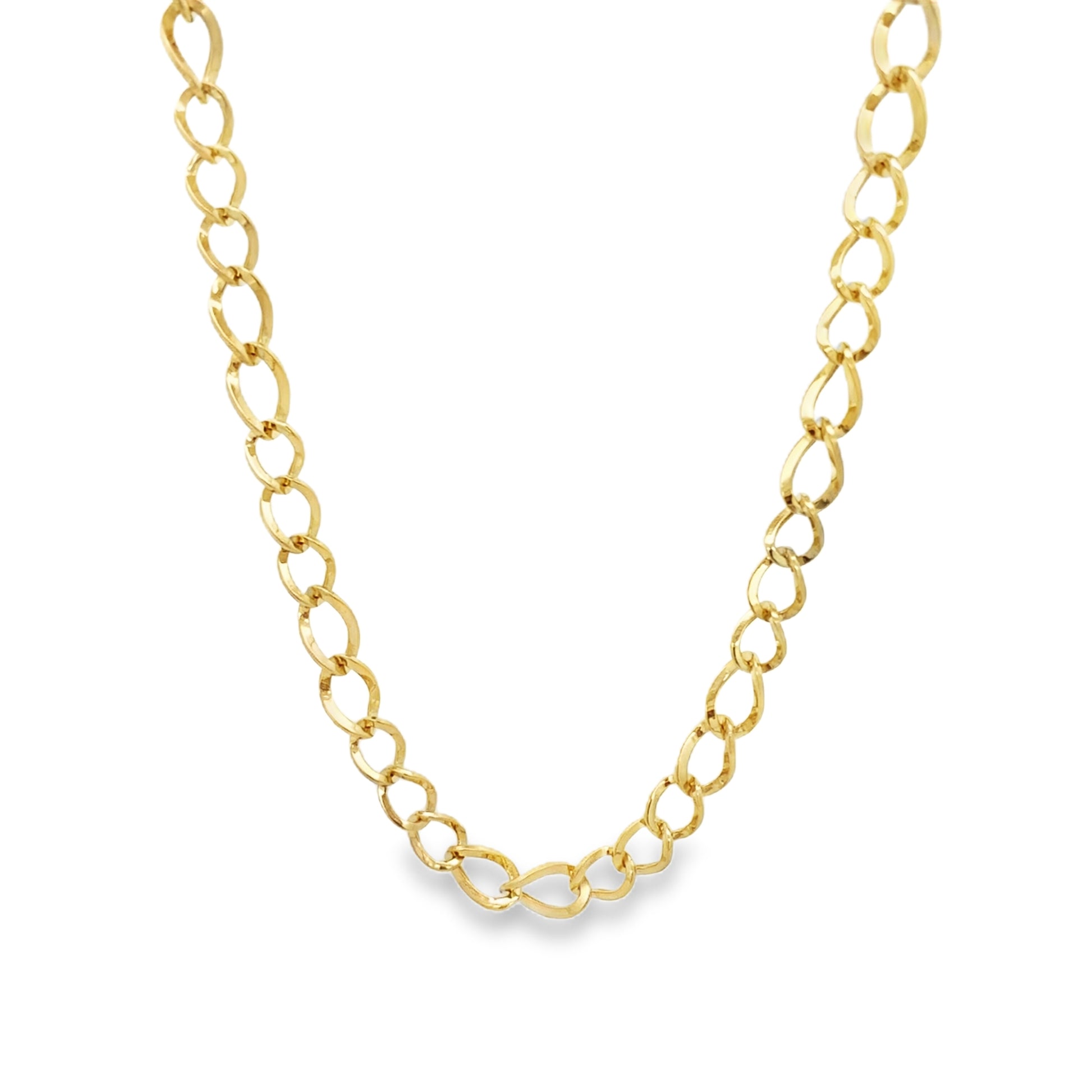 Unleash your inner glamour and sophistication with this luxurious 10K yellow gold necklace. Hand-crafted with a captivating free form link design, this 18 inch necklace is a true statement piece. Made with 3.5Dwt of the finest gold, it sparkles and shines with every move you make. Elevate your style and exude elegance with this one-of-a-kind necklace.