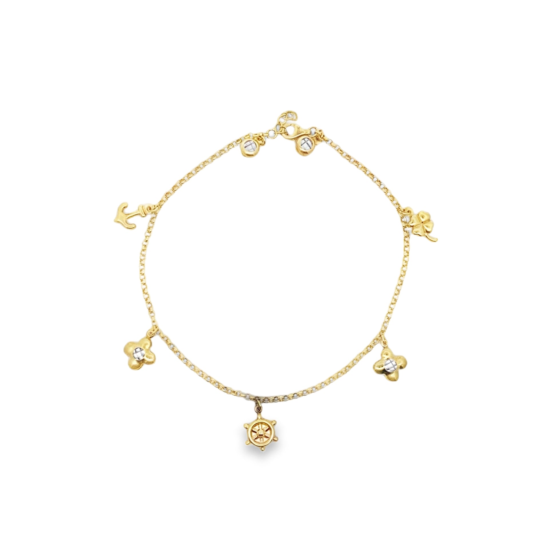 10K Yellow Gold Rolo Link W/Charms Anklet 10In 3.7Dwt