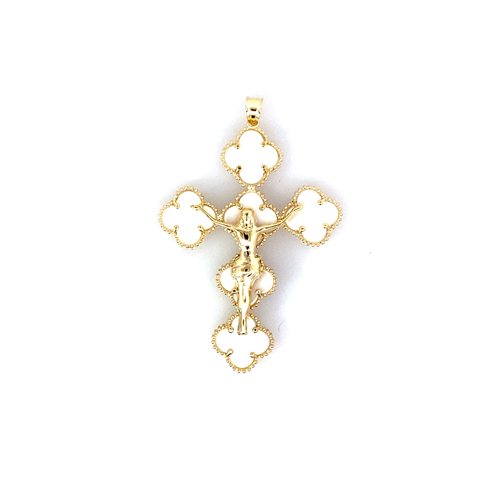 14K Yellow Gold White Flowers Reversible Crucifix Pendant 4.5Dwt